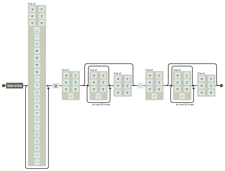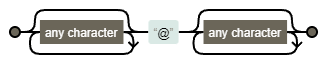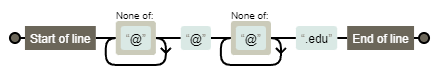 print("Невалідна адреса електронної пошти")Комп’ютер використовує свого роду машину, реалізовану в програмному забезпеченні, відомому як скінченний автомат (англ. finite state machine) або недетермінований скінченний автомат. Візуально це можна зобразити так: