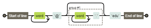 ^\w+@(\w+\.)?edu$Запис (\w+\.)? означає, що група записів \w+\. може зустрічатися 0 або 1 раз. Таким чином, ми можемо врахувати варіативність піддоменів.