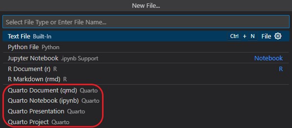 Рисунок 23.2: Меню створення Quarto–проекту у VS Code